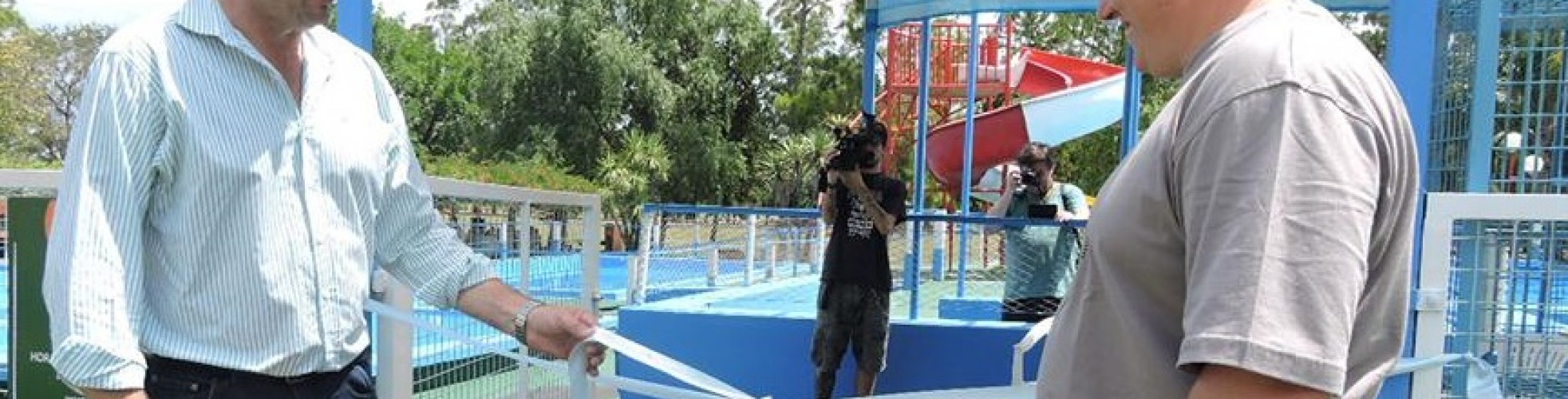 El Presidente Municipal, Gustavo Hein, y el Director de Deportes, Patricio Pesce, encabezaron el acto y el Sr. Verbauvede en representación del Padre Raúl Laderach realizó la bendición de las piletas, como se hace temporada tras temporada.